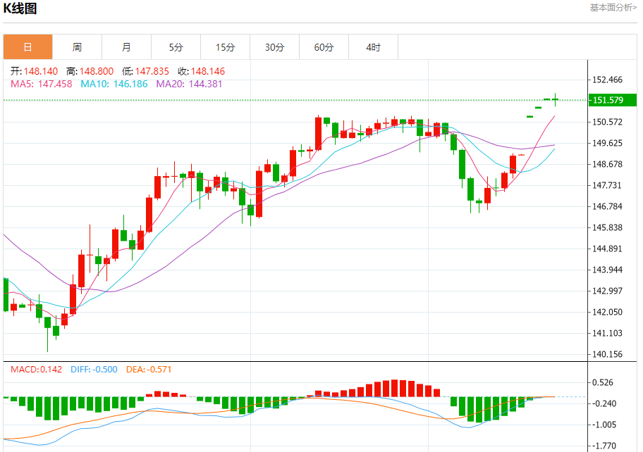 今日周五,截止目前美元兑日元报151.589,下跌0.01%。