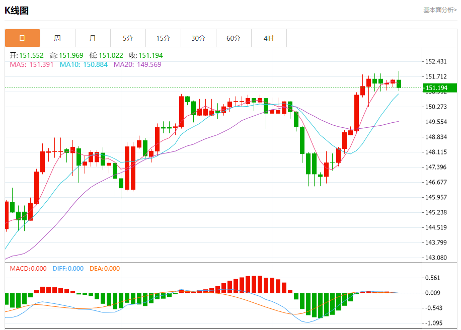 周三纽盘,美元兑日元交投于151.203,跌幅为0.24%。