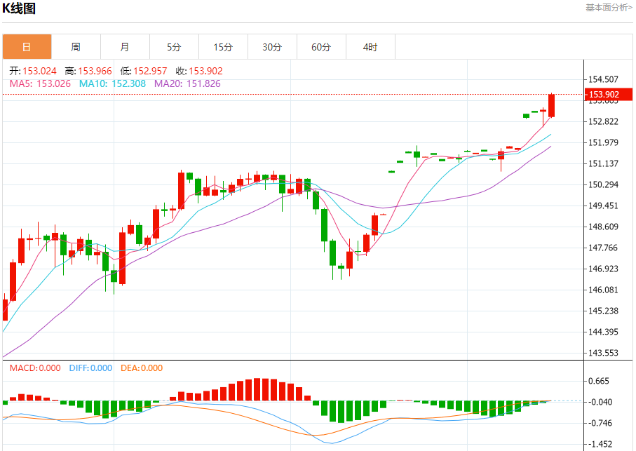 预计今天的交易区间在153.00支撑和154.60阻力之间。
