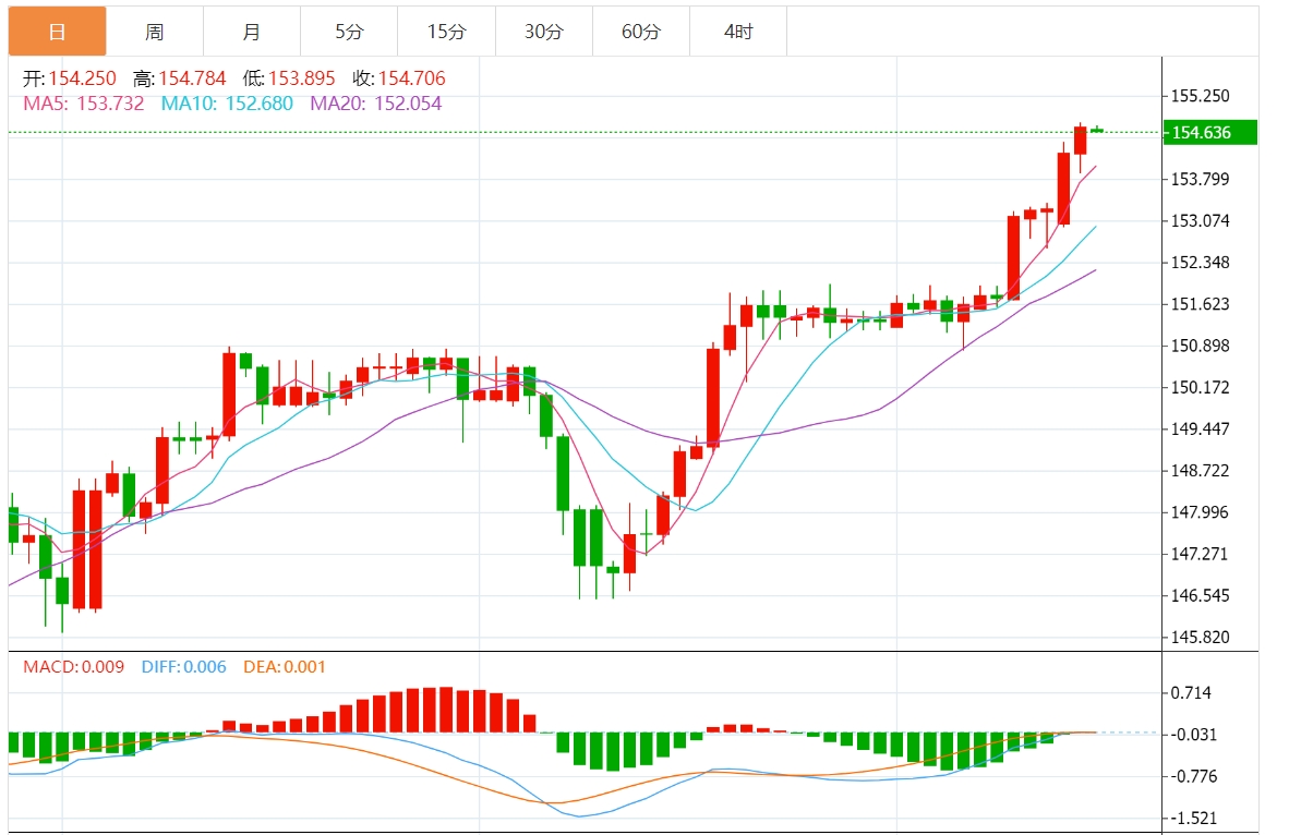 预期交易范围:在153.80支撑和155.50阻力之间。