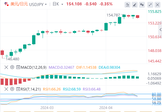 美元/日元远高于50日和200日均线,证实了看涨的价格趋势。美元/日元突破4月16日高点154.787将支持其升至155关口。
