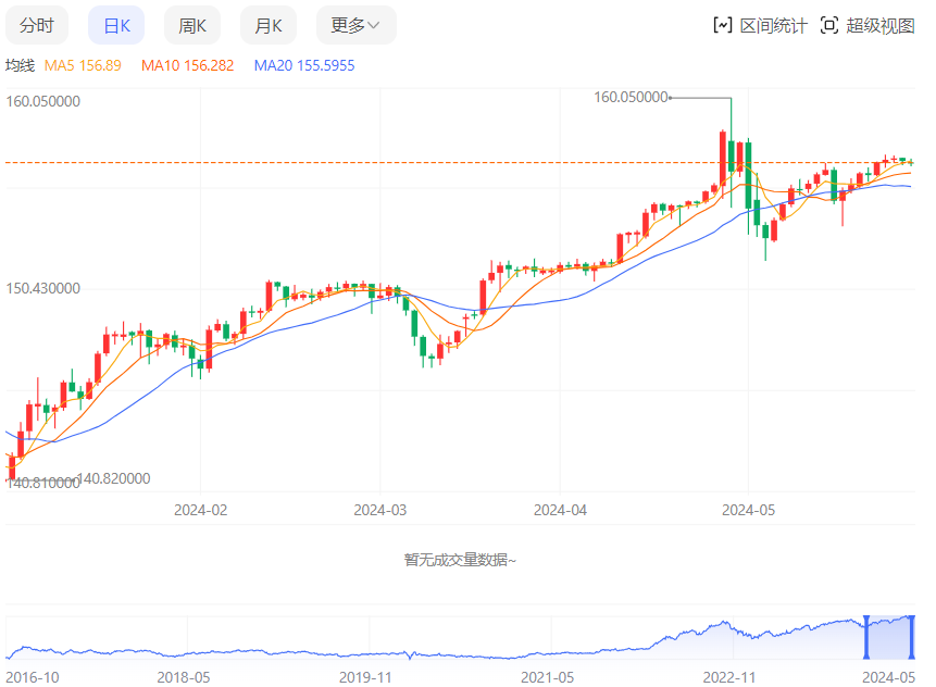 今日周二,截止目前美元兑日元报156.82,下跌0.04%。