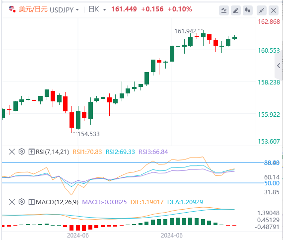 美元/日元周三交投于161.50附近。根据日线图分析,该在上升通道模式内保持其上升轨迹,表明看涨偏见。除了这种看涨前景之外,14天相对强弱指数(RSI)仍高于50水平,加强了上升趋势的强度。