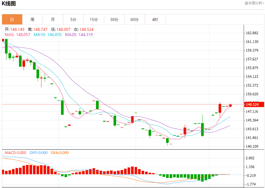 今日周三,截止目前美元兑日元报148.540,上涨0.23%。