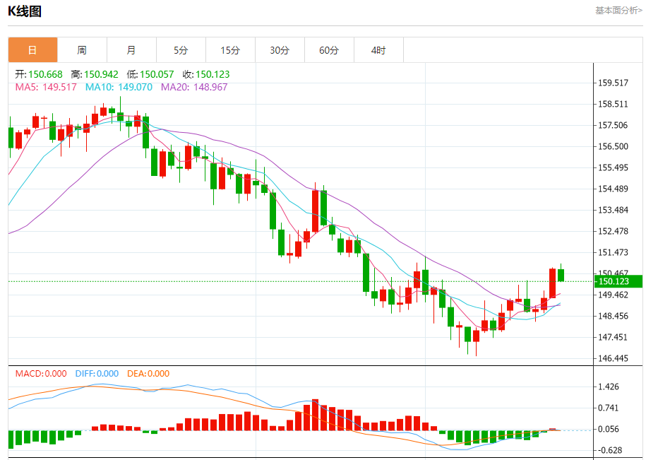 周二纽盘,美元兑日元交投于150.126,跌幅为0.38%。