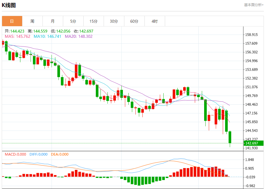 今日周五,截止目前美元兑日元报142.703,下跌1.21%。