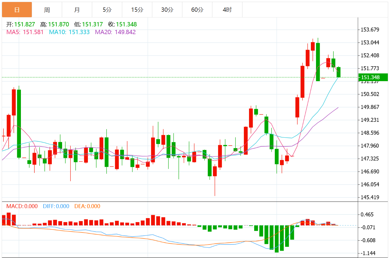 技术日线图形结构来看,美元兑日元在连续回踩151.70支撑后形成明显的“高低点抬升”结构,显示出中期上行趋势依旧完好。