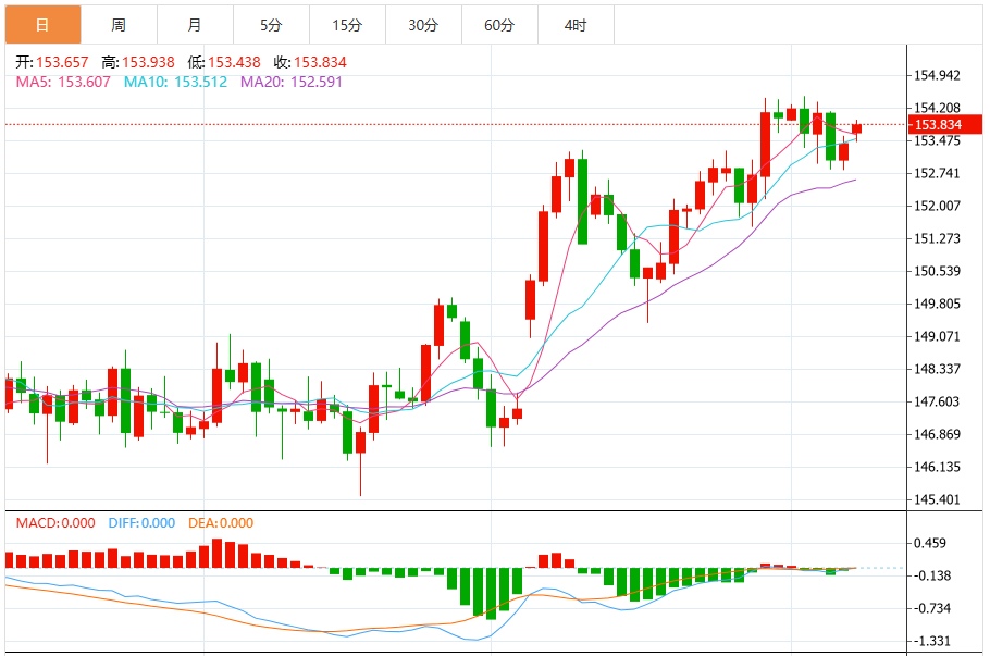 技术上,美元/日元在日线图上维持上行通道高位震荡,支撑位约在153.60附近,阻力位关注154.50,短期仍以震荡偏强格局运行。