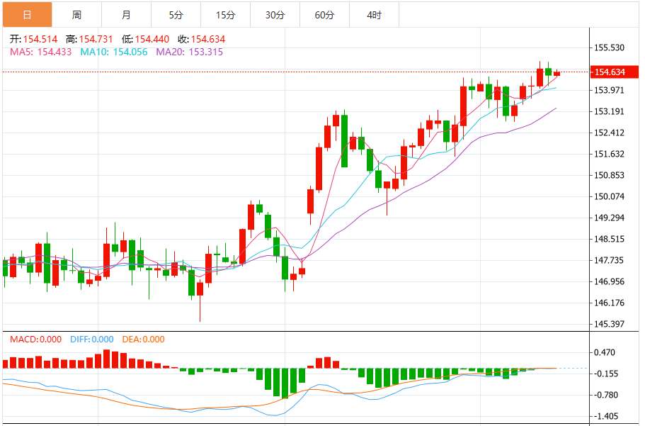 从技术面看,美元兑日元价格若价格稳定在155.00心理关口之上,将确认多头趋势延续,目标区间位于155.60至156.00。