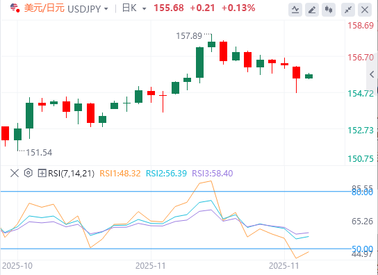 事实上,日本银行行长上田一夫周一表示,12月加息可能正在考虑中。这些因素,加上干预担忧,有助于限制日元更深层的损失。另一方面,美元(USD)在美联储本月可能再次降息的押注中,难以吸引任何有意义的买家,这也限制了美元兑日元的涨幅。