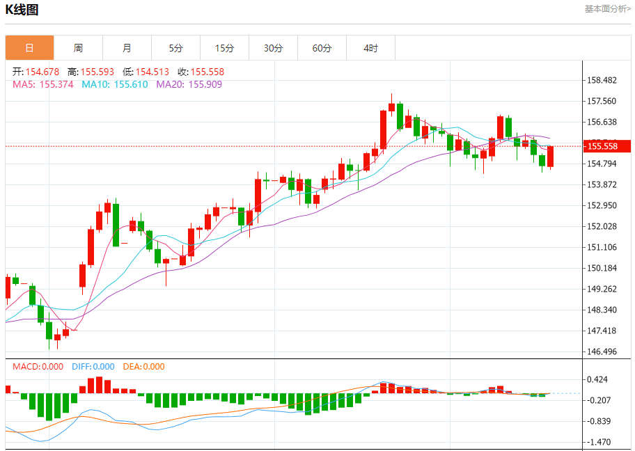 周三纽盘,美元兑日元交投于155.567,涨幅为0.55%。