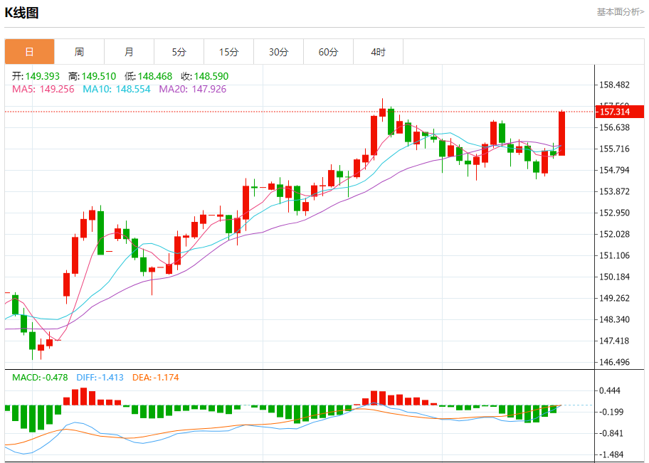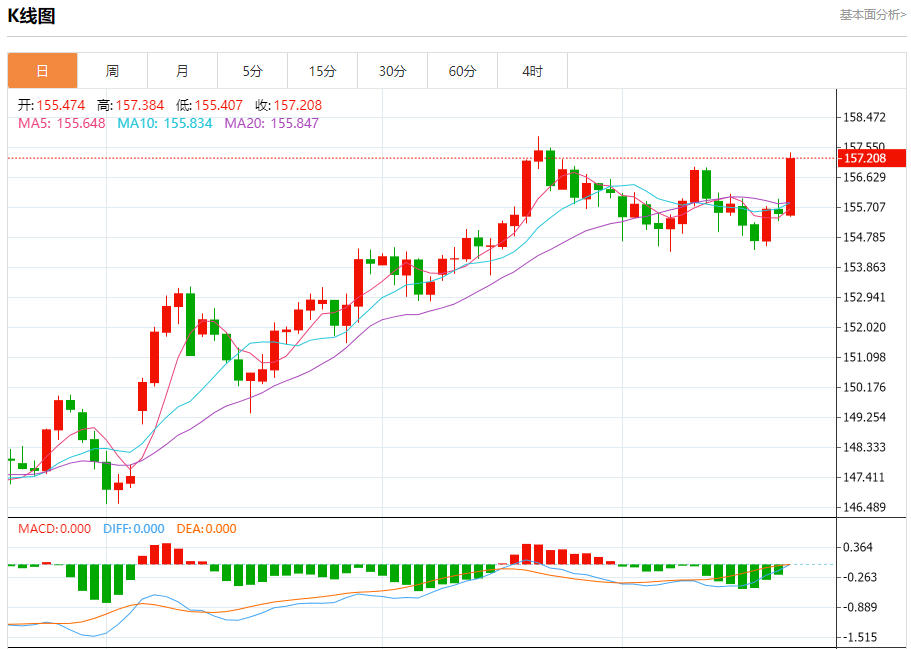 周五纽盘,美元兑日元交投于157.239,涨幅为1.09%。