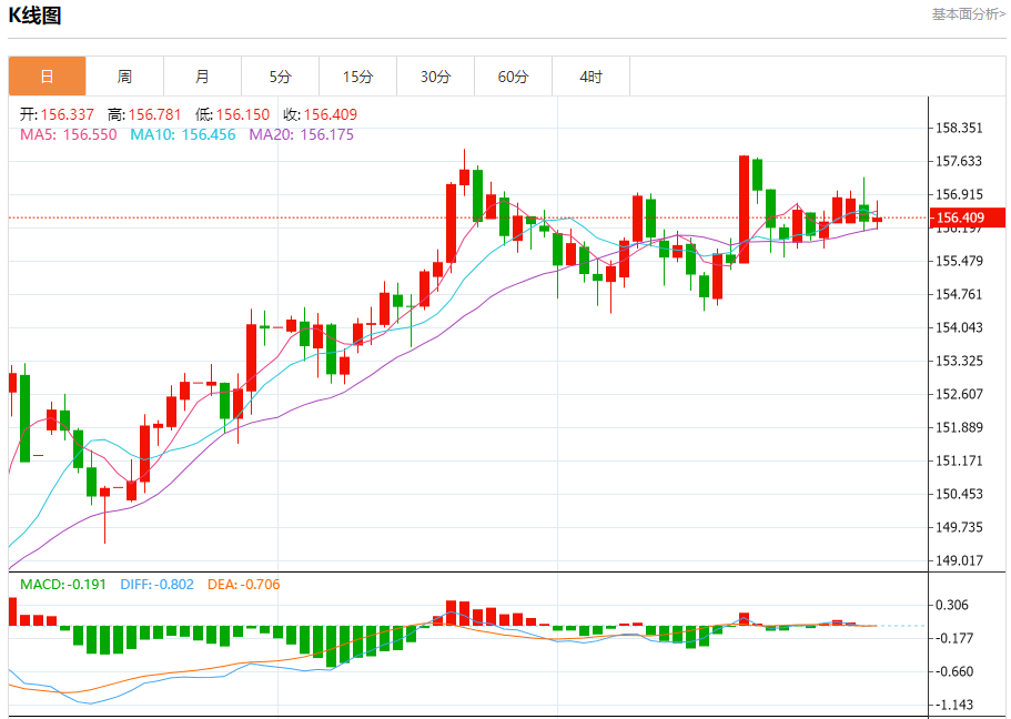 200期简单移动平均线(SMA)持续上涨,美元兑日元保持上方,强化了看涨倾向。移动平均线收敛背离线(MACD)位于信号线之上,略微处于正区间,直方图略微上升,暗示动能增强。200期均线156.04为直接动态支撑。