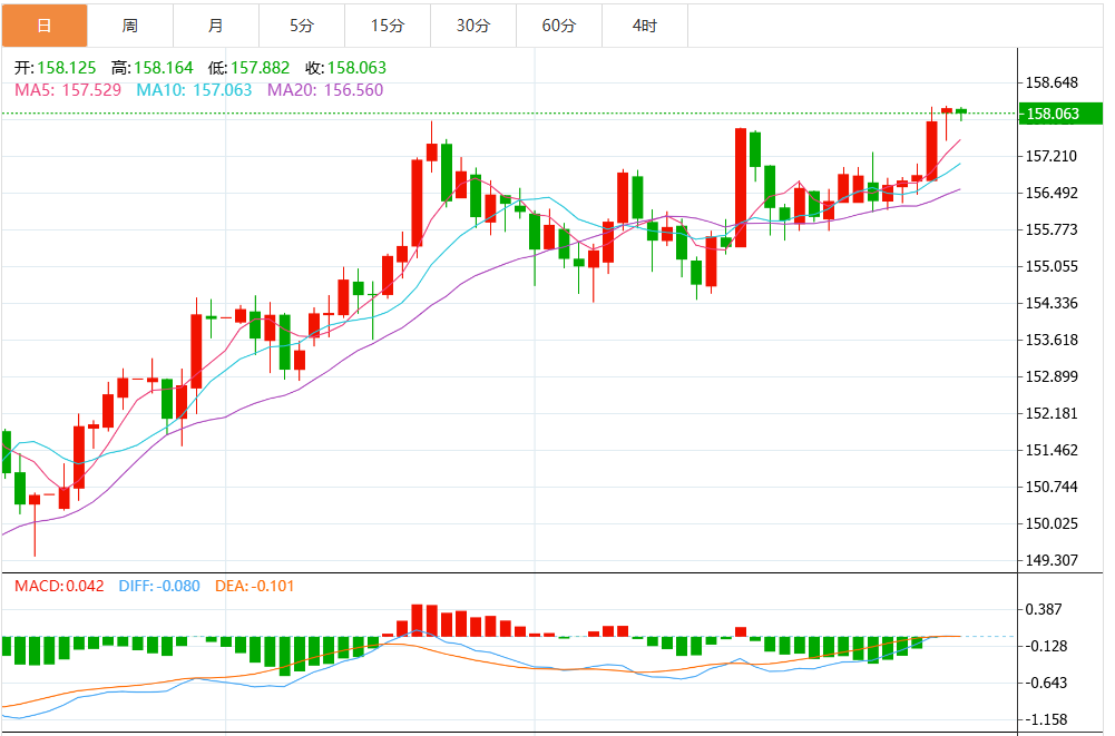 从技术图形来看,美元兑日元的日线结构仍偏向多头。价格多次试探前高区域,最近一次高点标注在158.186,显示出该位置已成为一个明确的心理和技术双重阻力带。下方支撑则集中在157.000一线,这是一个重要的分水岭。若汇价回调不破此位,意味着多头趋势尚未破坏;一旦有效跌破,并进一步下探,则需警惕回调可能扩大至156.50甚至更低水平。