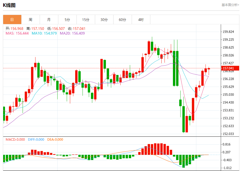 今日周五,截止目前美元兑日元报157.039,上涨0.00%。