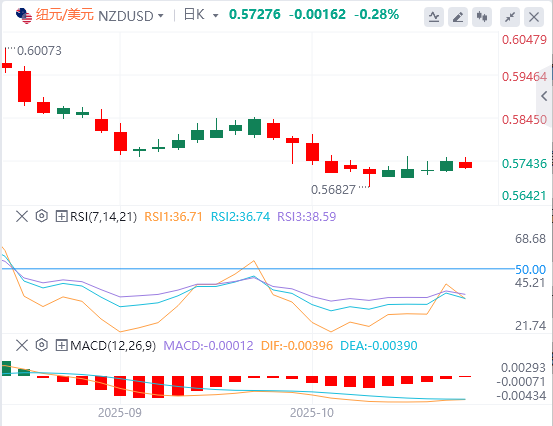 纽元/美元守住六个多月低点0.5740左右。纽元的整体趋势看跌,因为所有短期到长期指数移动平均线(EMA)都向下倾斜。14天相对强弱指数(RSI)保持在40.00下方,表明看跌势头强劲。