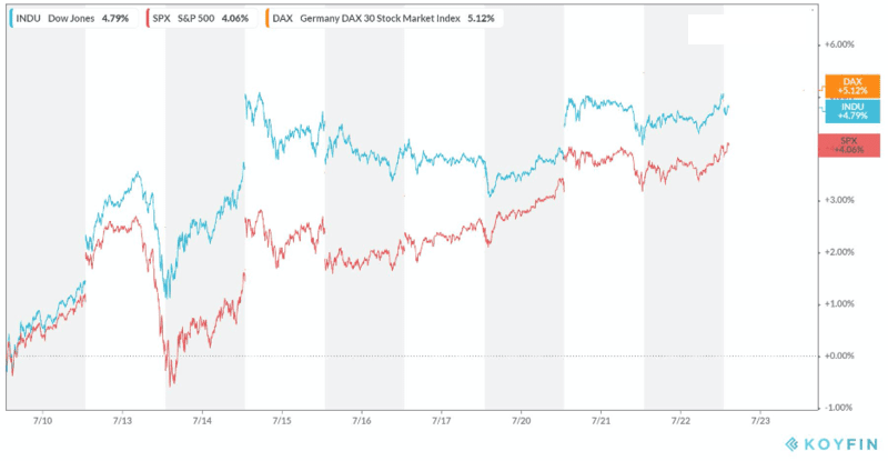 (过去十天道指、标普500和德国DAX指数,来源:KoyFin)