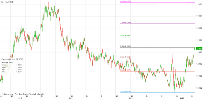 欧元/美元的多头再次占据主导地位,但反弹停滞在1.1597点位,在美国数据公布后,价格受到影响。在欧盟上周做出了支持欧洲经济的决定之后,欧元在市场上的需求旺盛。交易员似乎从美元资产转向欧元区资产,德国DAX指数在过去10天表现优于道琼斯工业指数和标普500指数就是最好的证明。