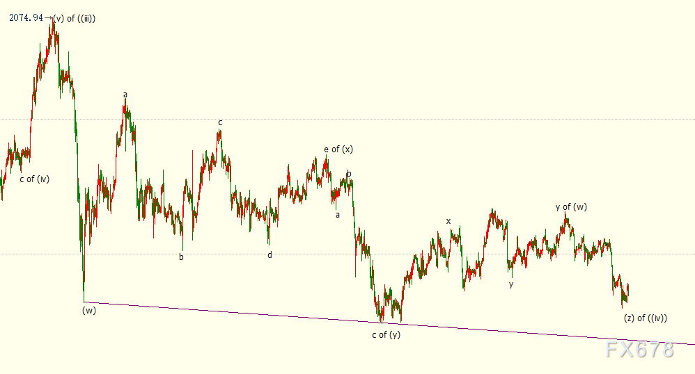 现货黄金自2075美元开启的调整((iv))浪行情进一步复杂化,料呈现(w)-(x)-(y)-(w)-(z)五子浪震荡收敛模式。目前,金价处于自1931美元开启的下行(z)浪中,下方支撑看向1835美元附近。