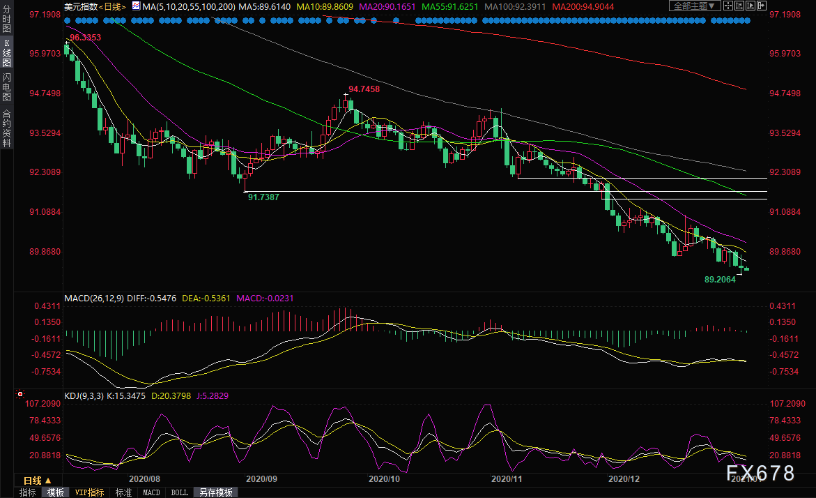 周四(1月7日)亚市盘初,美元指数徘徊于逾两年半低点附近,隔夜美元指数再度下探,最低触及89.21,为2018年4月底以来新低。