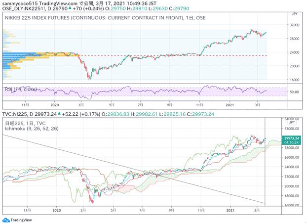 昨天的东京证券市场,受到美股NY道琼斯指数连续上涨并不断创下历史新高的背景下,日经平均指数日盘一度站上30000点整数位之后显得承压较重,尾盘小幅回落后在29900点一线收盘。前一天美股市场上,NY道琼斯连续7天上涨并创去年8月以来的最高纪录,同时高科技股比率较高的纳斯达克综合指数也出现了回升。受此影响,东京市场早盘买盘占据优势,在全球经济复苏预期下,经济景气类个股保持良好的走势。同时由于美国长期利率回稳之后,半导体等高科技股也出现一定程度的反弹,日经平均指数在日盘早些时候一度上涨至30000点整数位一线以上。之后由于在FOMC声明正式出炉前短期资金的获利了结,最后小幅回落收盘。进入欧美交易时间后,NY道琼斯指数同样受到了来自短期资金退场的影响回落至32800点附近。同时晚间公布的美国2月份零售业总额不及市场预期也加速了做多势力的获利了结。受此影响,日经指数期货晚盘回落至在29600点一线后,尽数回吐了日盘的涨幅,横盘整理收盘。