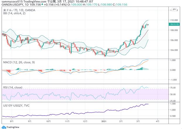 昨天的东京外汇市场,在美联储议息会议进行期间走势上缺乏明显的方向感,在长期汇率保持坚挺的背景下,美元兑日元汇率在109日元一线保持横盘整理的态势。在上周美国国会通过了1万9000亿美元规模的新冠病毒追加经济对策法案后,市场关注的焦点移向正在进行的美联储议息会议。本次FOMC将公布经济前景预期和FOMC成员的预期利率。外界认为本次美联储很有可能向上修正经济前景预期,而利率方面虽然之前表示到2023年底为止不会有所变化,但是否会在本次会议中做出微调也备受关注。债券市场方面,美国10年期国债收益率小幅上涨至1.6179%,虽然在FOME声明公布之前市场上观望情绪较重,但是中长期利率上升的预期依旧占据着优势。美元兑日元汇率在站上109日元一线之后显得有些后劲不足,在重要经济事件之前,短期想要向110日元整数位发起挑战的可能性较低。