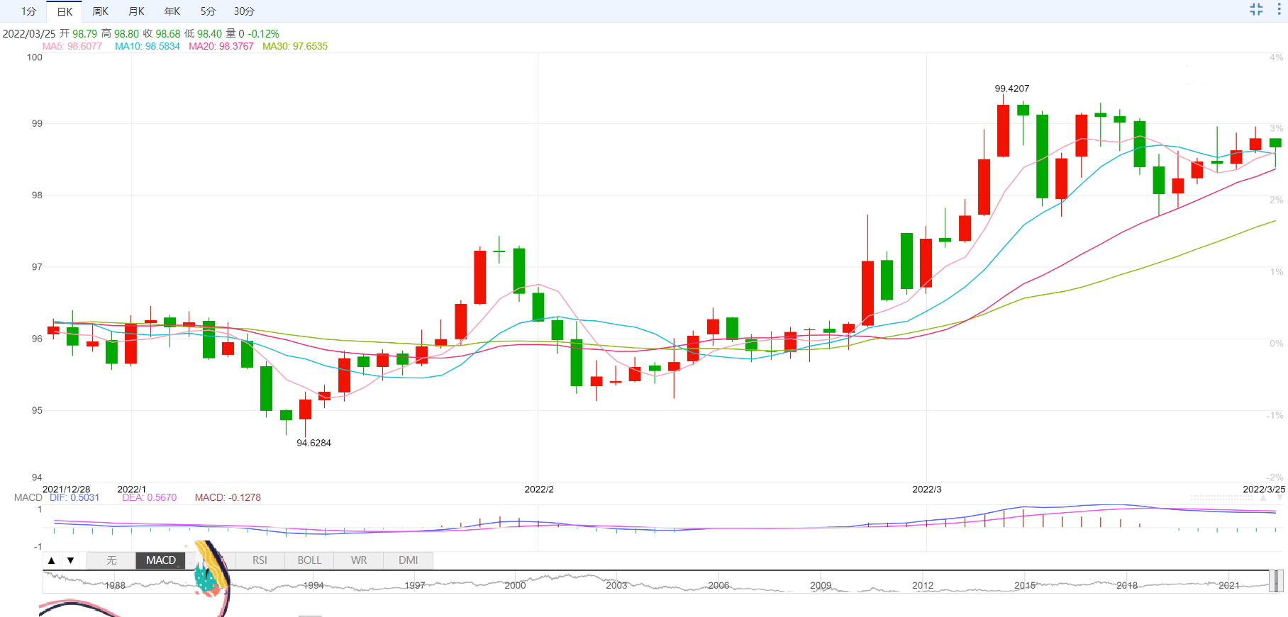 现在,美元指数回落0.17%,报98.61,突破98.96(每周高3月22日)将打开门99.29(高3月14日),最后99.41(2022年3月7日高)。