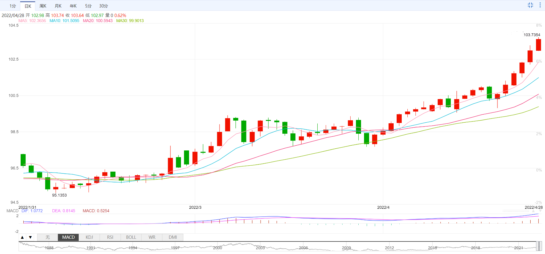 截至周四,美元指数已连续第六个交易日上涨,较4月21日99.80点的周低位上涨近4%。