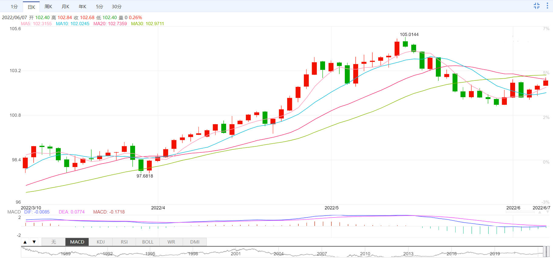 现在,美元指数上涨0.08%,至102.49点,突破102.83点(6月7日的月度高点)将打开大门,至105.00点(2022年5月13日的高点),最终至105.63点(2002年12月11日的高点)。