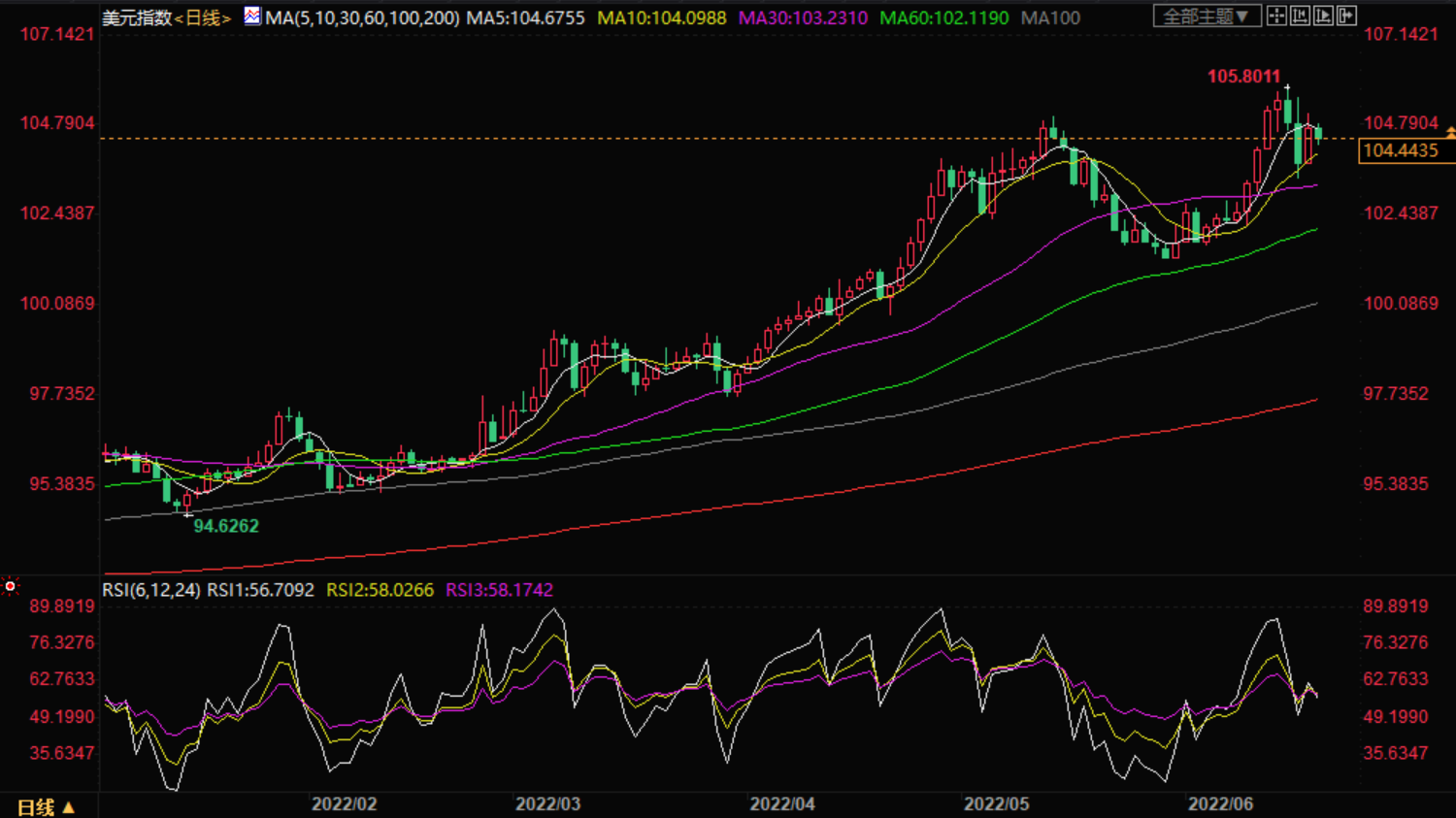 在美联储6月15日加息75个基点后,该指数攀升至105.80附近的新高,承压。