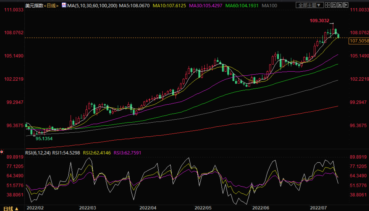 现在,美元指数下跌0.40%,报107.55,接下来的竞争点是107.37(7月18日的周低点),然后是103.67(6月27日的周低点),最后是103.41(6月16日的周低点)。