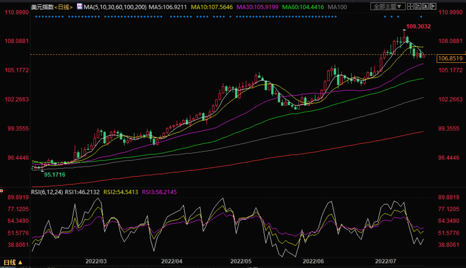 分别位于106.83和106.92的20期和50期指数移动平均线(ema)已经走低,这增加了下行过滤器。