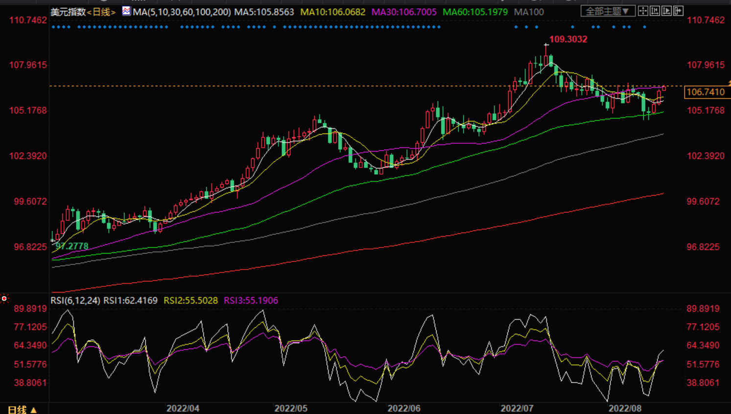 现在,美元指数上涨0.07%,至106.55点,突破107.42点(7月27日fomc会议后的周高点)将会暴露109.29点(2022年7月15日的高点),然后是109.77点(2002年9月的月度高点)。