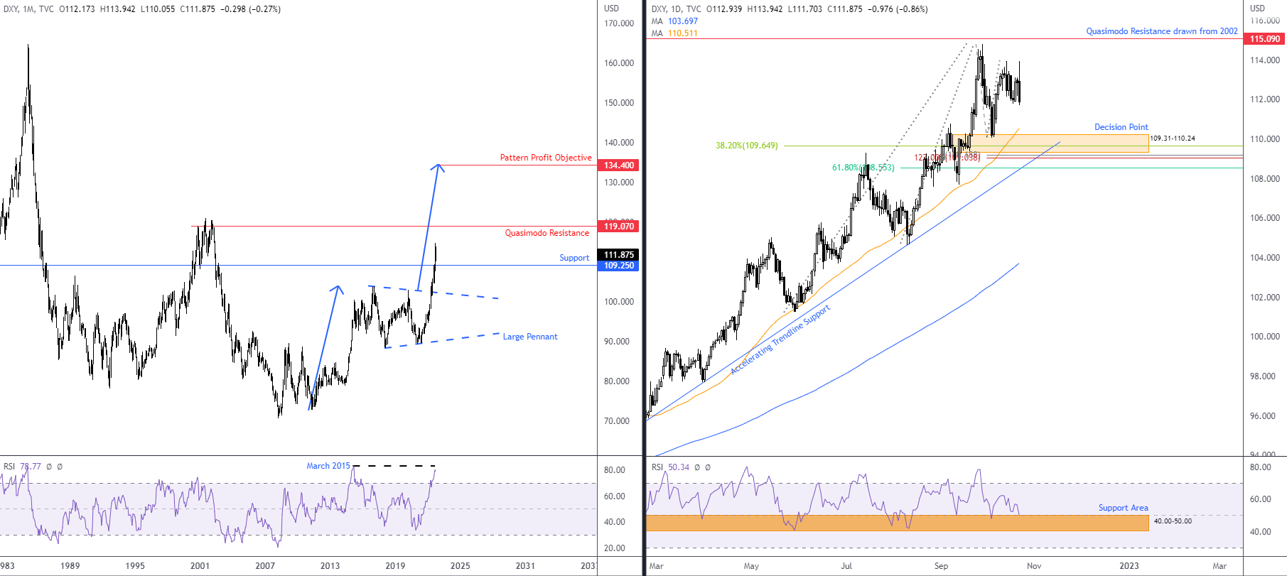月度支撑位在109.25(有空间走高)、长期上升趋势和每日RSI支撑位的组合加强了上述技术汇合。因此,预计会继续扞卫每日决策点AREA,随后最终突破115.09的日线阻力位,该指数可能刷新20年顶部。