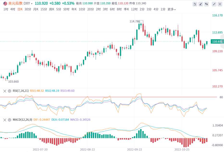 RSI技术指标向上运行,在110.00之上,看涨,目标价位为111.00,然后为111.27。