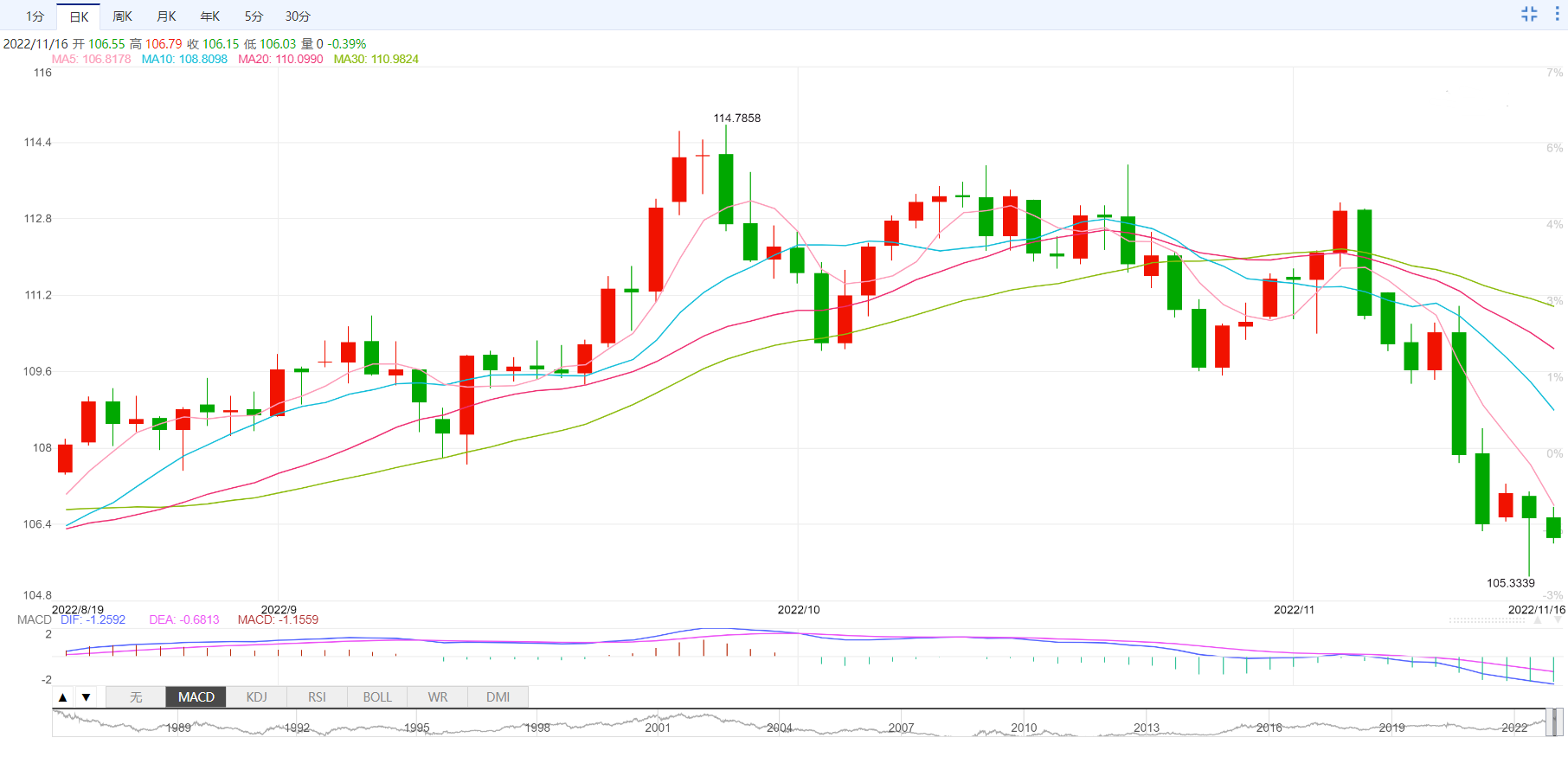 目前,美元指数在106.21处下跌了0.7234点,如果跌破105.34点(11月15日),将有可能达到104.94点(200日移动平均线)和104.63点(8月10日)。