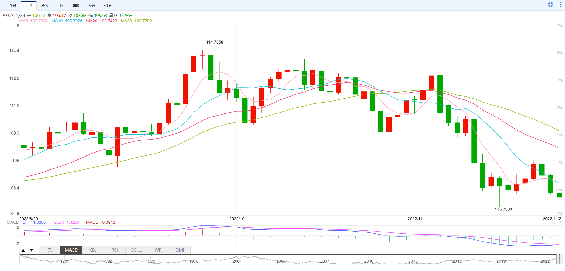 目前,美元指数在105.94处下跌了0.15%,如果跌破105.34(11月15日的月均线最低值),将有可能达到105.27(200日移动均线最低值)和104.63(8月10日的月均线最低值)。