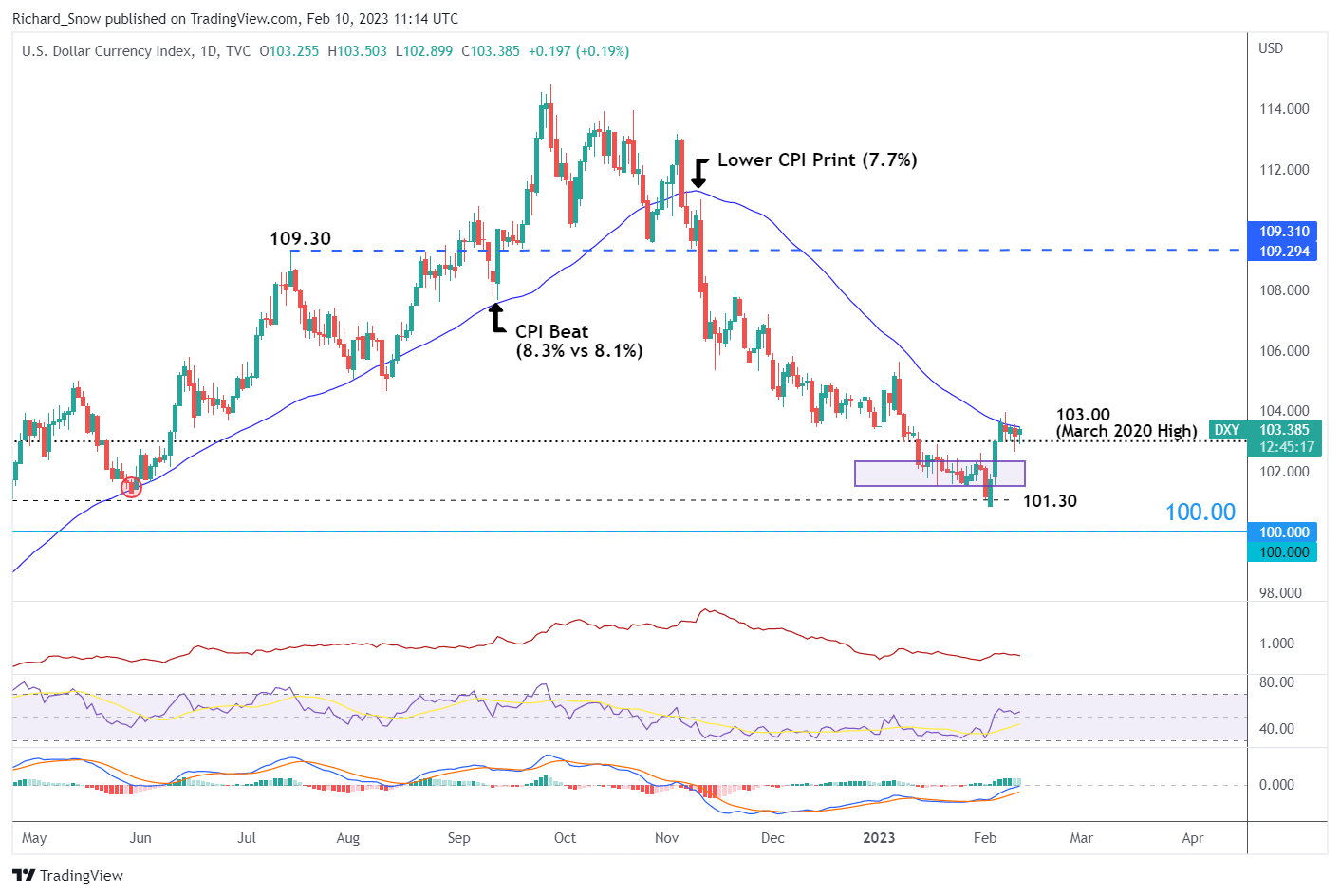 下一个感兴趣的区域是在2020年3月的高点103水平附近。如果美元保持稳定,考虑到当前的通货紧缩趋势表明,我们将看到另一个令人鼓舞的CPI数据,从而增加美元疲软,这可能是一个浅薄的胜利