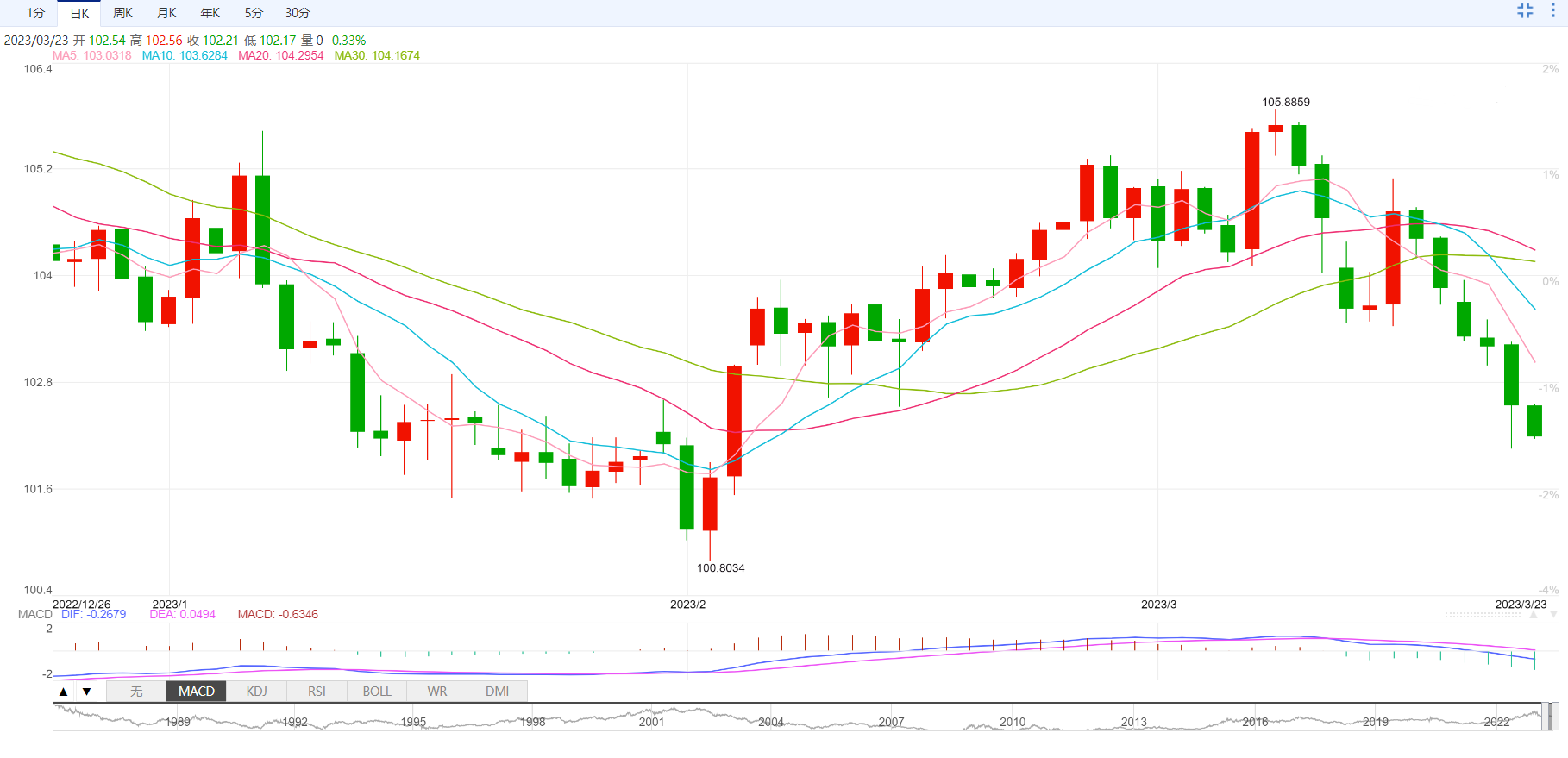 因此,美国2年期国债收益率从当天的4.259%跌至3.958%的低点。美元指数DXY从103.265的高点跌至102.065的低点。