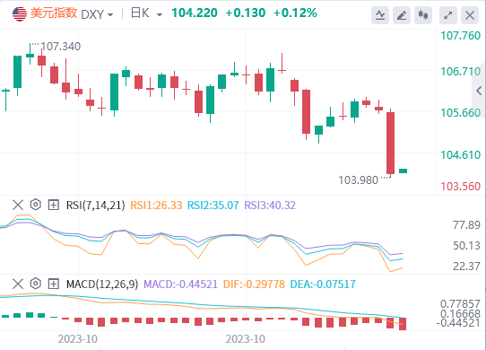 在公布较低的通胀数据后,美元指数暴跌至104.05,跌幅超过1%,接近9月份以来的低点。