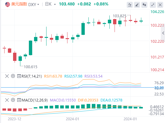 该指数与50天指数移动平均线(EMA)103.376一致,略高于200天EMA103.060表明看涨势头稳定。