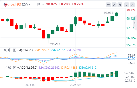 10月8日,美元指数连续第三天延续涨幅,周三亚洲时段交投于98.90附近。联邦公开市场委员会(FOMC)会议纪要9月的政策会议将在北美时段晚些时候受到关注。