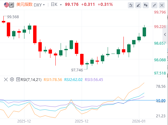 自 12 月 24 日触底至 97.70 附近以来,美元指数已开始稳健复苏,不仅重新站上 99.00 关口,还突破了 98.80 附近的 200 日均线。这一突破为指数重返 2025 年 11 月峰值 100.39(11 月 21 日)铺平道路,一旦突破该峰值,可能尝试向 2025 年 5 月上限 101.97(5 月 12 日)迈进。