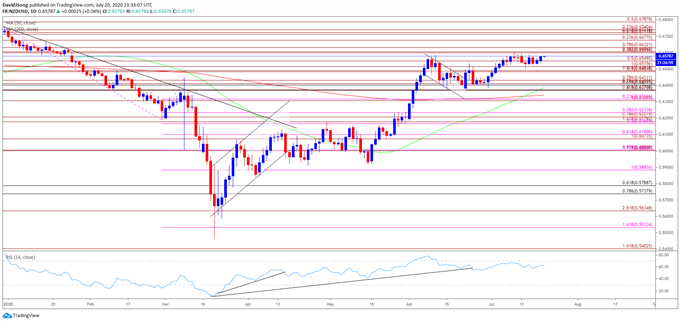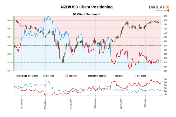 7月份纽元在主要货币中表现出众,IG情绪指标(散户持仓报告)继续反映货币市场投资者拥挤交易行为,自5月份以来散户持续持有纽元/美元净空头。IG情绪指标通常作为反向指标,散户持续看空纽元/美元意味着未来数日纽元/美元有望继续上涨。