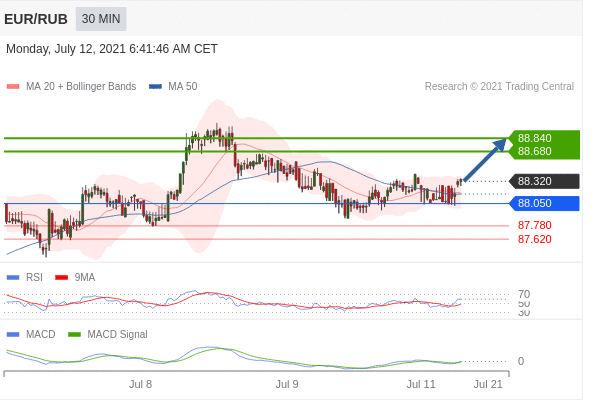 备选策略: 如跌破 88.050 ,EUR/RUB 目标方向定在 87.780 和 87.620 。