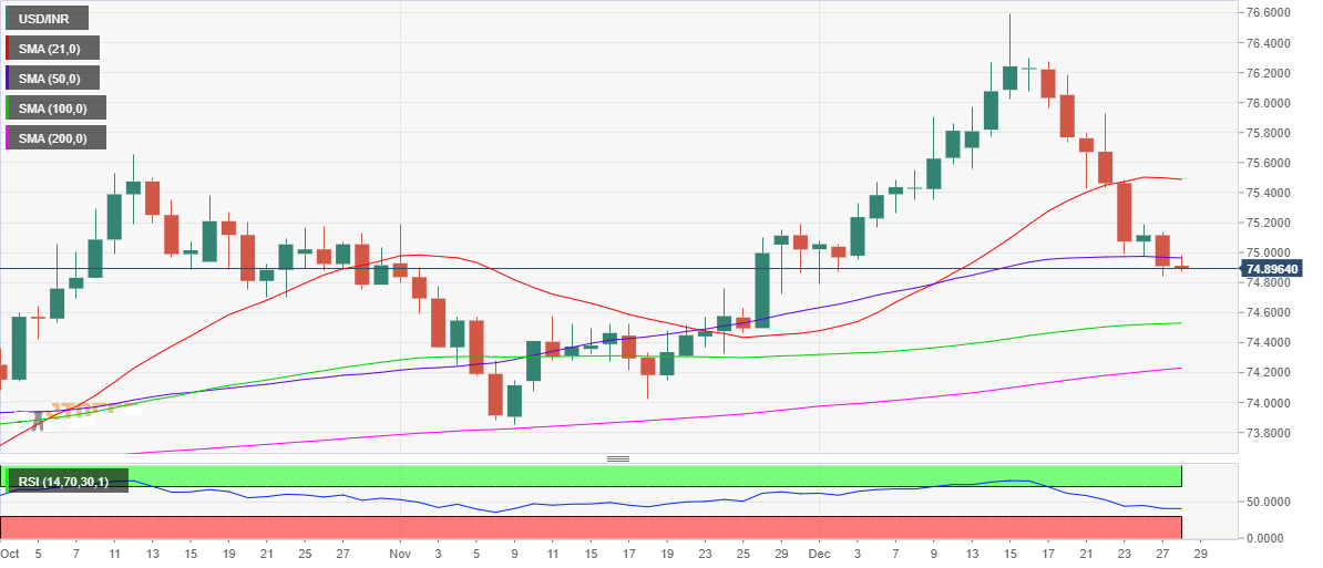 美元/印度卢比周二开盘处在50日均线下方,空头有望再度跌至 74.50 心理水平。温和看涨的 100日均线处在该水平附近,若跌破该支撑,空头可能指向 11 月 29 日低点 74.72。