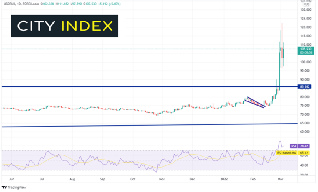 3月6日,美国国务卿布林肯表示,美国总统拜登和政府各部门正讨论是否对俄罗斯实施石油禁运,以对俄罗斯实施进一步制裁。由于投资者担心石油禁运将摧毁俄罗斯经济,俄罗斯卢布汇率在离岸交易中一度下跌10%,创历史新低。截至发稿,卢布汇率跌至1美元兑105卢布。 CityIdx驻悉尼高级市场分析师attio表示:“这一