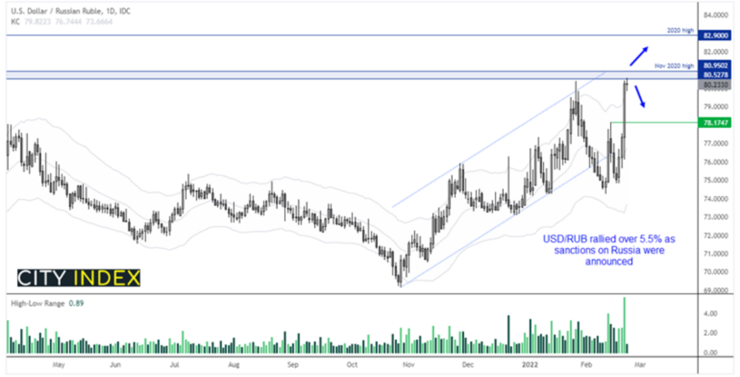 入侵乌克兰似乎正在进行中,俄罗斯卢布可以说第一个沦为俄乌冲突下的“牺牲品”。 目前市场上不乏关于俄罗斯的头条消息,而且看起来也没有马上平息的迹象。过去24小时里,市场情绪起起落落,最终恶化。在拜登-普京举行峰会的期待下,市场反弹。但俄罗斯几个小时内就给这样的期待兜头一盆冷水,导致之前