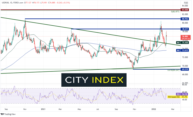 交易者要小心俄乌危机相关消息可能导致美元/卢布急涨或急跌。 美国1月CI年率报在7.5%,高于7.3%的预期值和7.0%的前值,创下1982年2月以来最高点。剔除不稳定的食品与能源的价格的核心通胀率上涨6%,高于5.9%的预期值和5.5%的前值。市场随即计入3月有50%的几率加息50个基点。圣路易斯联储主席ullard随后宣布,