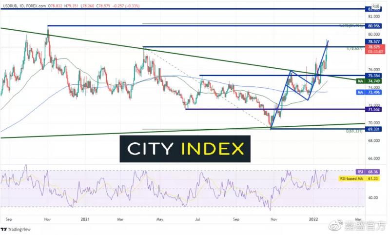 如果有关俄罗斯入侵乌克兰方面继续传出负面消息,可能更加有力地推动美元/俄罗斯卢布上涨。 俄罗斯正在乌克兰边境集结军队,到目前为止人数达到10万左右。俄罗斯卢布目前不断下跌,消息面的原因如下: 英国方面周一表示,俄罗斯正试图扶持亲俄罗斯的乌克兰总统,将现任总统取而代之。 英国